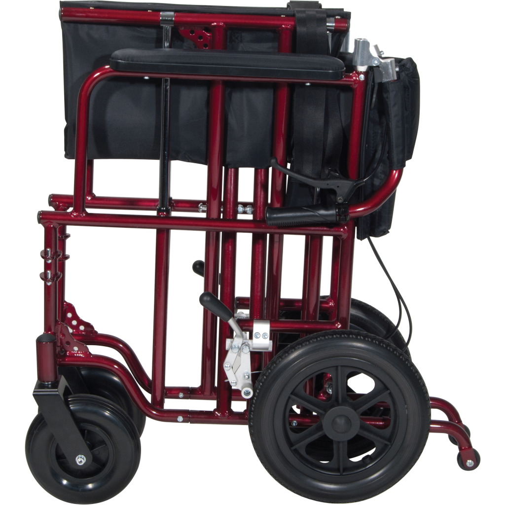 The attachable push bar with padded foam grip makes it easy to push, and the back folds down for convenient and easy storage with an easily accessible lever on the chair back. This transport chair comes with 12″ rear flat-free wheels, swing-away footrests and fixed, padded, full length desk arms for additional comfort. The heavy-duty, nylon reinforced upholstery has two carry handles for when the seat is folded for storage and transport, making it easier to carry. Comes with lever and companion activated wheel locks, ensuring users safety.