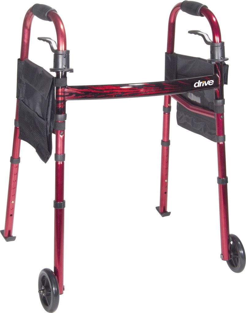 - Easily folds tool-free to ½ the size of a traditional walker (Figure A – B) and can be stored in a “Ready Set Go” Pouch (Figure C)